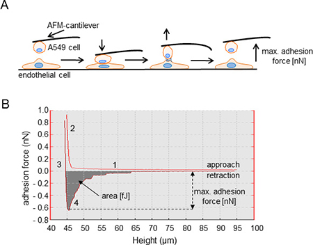 Figure 1: Illustration of adhesion force measurements using single cell force spectroscopy (SCFS). (A) Single A549 cells are picked with a WGA-coated AFM-cantilever and brought into contact with HMEC-1 endothelial cells. A constant force (1 nN) is applied to maintain the contact between both cells for a period of 2 s. The force needed to separate the two cells (adhesion force [nN]) is measured during retraction of the cantilever. (B) Representative example of a force-distance curve. The characteristic phases of the experiment are indicated by numbers. 1. Approach of the A549 cell to an endothelial cell. No cell-cell contact has been formed. 2. The NSCLC cell is “pressed” onto the endothelial cell, positive force is applied. 3. Retraction of the cantilever so that the A549 cell is lifted off of the endothelial cell. 4. Detachment of the A549 cell from the endothelial cell. The turning point of the curve represents the maximal adhesion force [nN], and the shaded area under the curve is a measure of the detachment work [fJ].