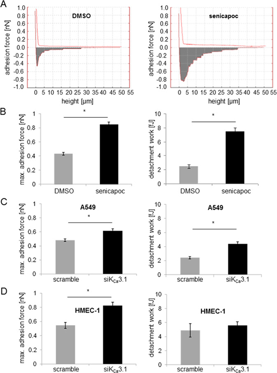 Extravasation is a crucial step of the metastatic cascade of NSCLC cells. It is preceded by adhesion of NSCLC cells to the vascular endothelium. We employed single cell force spectroscopy to investigate how adhesion of NSCLC cells to endothelial cells is regulated by KCa3.1 channels. We blocked KCa3.1 channels using either the inhibitor senicapoc or silencing with siRNA. Figure 1 depicts a sketch of the experimental procedures. An A549 cell attached to the cantilever of the AFM (atomic force microscope) is brought into contact with an HMEC-1 cell for 2 s. The force needed to separate the newly formed cell-cell contacts between A549 and HMEC-1 cells is measured while lifting the AFM cantilever (Figure 1). The first measurements were performed in the presence of senicapoc or its solvent DMSO. Under control conditions (DMSO) the maximal adhesion force and the detachment work amount to 0.43 ± 0.02 nN and 2.4 ± 0.26 fJ, respectively (N = 9 experiments with n = 20 HMEC-1 cells). These values strongly increase to 0.85 ± 0.03 nN and 7.5 ± 0.51 fJ in the presence of the KCa3.1 blocker senicapoc (Figure 2A and 2B; (N = 9 experiments with n = 20 HMEC-1 cells).
