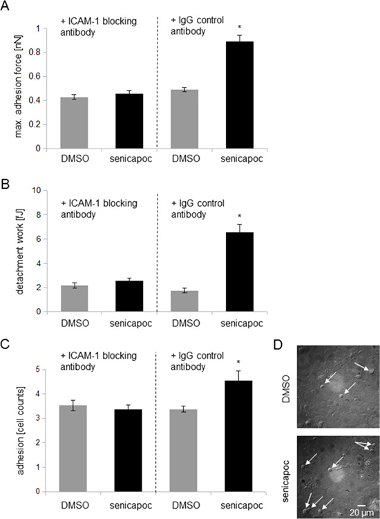 If ICAM-1 mediates the KCa3.1 channel-dependent increase in adhesion between A549 and HMEC-1 cells, this effect will be abolished by ICAM-1 inhibition. To test this idea we performed additional single cell force spectroscopy experiments. A549 cells were preincubated with a monoclonal ICAM-1 blocking antibody or an IgG control antibody. Thereafter, the cells were attached to a cantilever, and the effect of senicapoc was evaluated. In the presence of the blocking ICAM-1 antibody, senicapoc fails to induce an increase in adhesion forces between A549 and HMEC-1 cells (Figure 4A and 4B). Adhesion forces amount to 0.43 ± 0.02 nN (control, DMSO; N = 7 with n = 20 HMEC-1 cells) and 0.46 ± 0.03 nN (senicapoc; N = 7 with n = 20 HMEC-1 cells). Similarly, detachment work is unchanged (DMSO = 2.15 ± 0.2 fJ; senicapoc = 2.53 ± 0.22 fJ). In contrast, adhesion force measurements using the IgG control antibody show a similar effect as obtained previously. The adhesion force under control conditions using DMSO amounts to 0.49 ± 0.02 nN, and in the presence of senicapoc, the adhesion force increases to 0.89 ± 0.05 nN (N = 7 with n = 20 HMEC-1 cells). The detachment work increases from 1.73 ± 0.19 fJ under control conditions (DMSO) to 6.53 ± 0.66 fJ, following treatment with senicapoc.