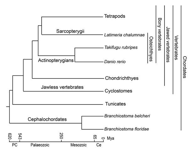 Figure 1: Phylogenetic tree and evolutionary time frame for chordates. Adapted from Yue et al. and Venkatesh et al. [2, 7].