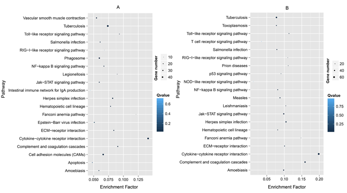 Fast-evolving genes in Bf vs Bb, the top 10% Ka and 15% Ka/Ks values were classified significantly into 20 and 19 KEGG pathways, respectively (Table 1). The results showed some immune- and disease-related pathways, such as the proteasome, Jak-STAT signaling pathway, the peroxisome, bacterial invasion of epithelial cells and NOD-like receptor signaling pathway (Figure 2). Some well-known pathways involved in energy production and amino acid metabolism were notable. For Dr vs Lc and Dr vs Tr, the significant results of enriched KEGG pathways for the MFEG set had 31 and 37 terms (Table 1), respectively. When the top 20 KEGG categories were plotted based on descending order of the significance level, we found that almost all pathways were related to a response to immune stimulation (Figure 3). These pathways primarily involved cell surface receptors in innate immunity, infections and immune diseases, cytokines, apoptosis and adaptor molecules in immune signaling pathways. Particularly, we detected “T-cell receptor signaling pathway”, “intestinal immune network for IgA production” and “hematopoietic cell lineage”, indicating that some of the genes associated with adaptive immunity were fast evolving in Dr vs Tr.