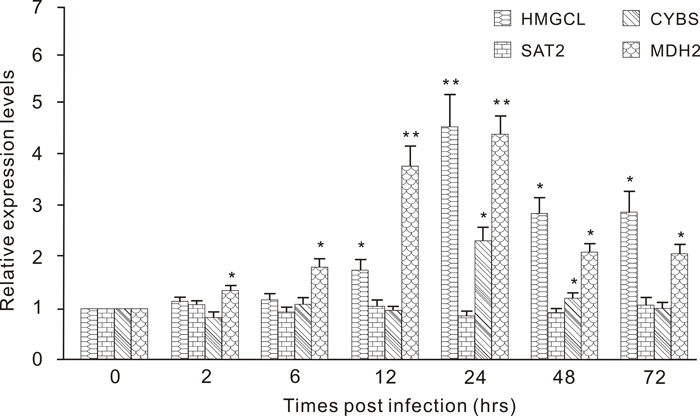 To determine the innate immune activity of the fast-evolving genes in metabolism or energy production-related pathways, we measured the expression of four of these genes in the muscle, intestine or skin of B. belcheri challenged by a LPS. The expression responses of four types of genes to LPS stimulation were determined over a 72 hour time course: mitochondrial hydroxymethylglutaryl-CoA lyase (HMGCL) in skin, diamine acetyltransferase 2 (SAT2) in the intestine, and succinate dehydrogenase cytochrome B small subunit precursor (CYBS) and mitochondrial malate dehydrogenase (MDH2) in muscle (Figure 4). Upon a LPS simulation, only one expression peak was detected for HMGCL at 6 hours post infection (hpi) with a 4.4-fold increase compared with the control, and the level of expression was significantly higher than that from 12 to 72 hpi. For SAT2, no significant increase was detected at any hpi. In this experiment, we found that CYBS only showed significantly higher expressions at 24 and 48 hpi than that in the control. Regarding the expression profile for MDH2, we detected an initial, significant up-regulation at 2 hpi, then reached a single expression peak in muscle at 24 hpi when the expression was 4.3-fold higher than that of the control. At the two later time points, the expression of MDH2 continued to be up-regulated, compared with that of the control.
