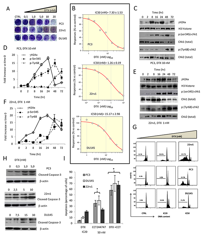First, we analyzed the effects of DTX on PC3, DU145 and 22rv1 cell lines. In Figure 1A we show the plate image representation of crystal violet stained PC3, 22rv1 and DU145 cells cultured in 24 well/plates with different doses of DTX (0-20 nM). Proliferation of these cells was inhibited by DTX (Figure 1B) with IC50 values of 7.20 nM in p53 null PC3 cells, 1.26 nM in p53 wild type 22rv1 cells, and 16.17 nM PTEN mutant and inactive DU145 cells. It is well known that DTX is able to induce replication stress promoting DSBs and leading to activation of multiple molecular pathways regulating DNA repair, including ATM-Chk2-p53 (22rv1 cell line), ATR-Chk1 (PC3 and DU145 cell lines) and PARP signaling. In addition we observed that DTX increased the levels γH2AX and phosphorylation of Chk1/2, which are indicative of DNA damage and kinase activity, respectively. In Figure 1C and 1E we show western blotting evaluation on molecular arrangement induced by 10 nM in p53 mutated PC3 cells (1C) and 1 nM in p53 wild type 22rv1 cells (1E). DTX doses close to the IC50 values were chosen for both cell lines. The levels of γH2AX, Chk1 and Chk2 were normalized using histone H3, whereas phosphorylated forms of Chk1 (p-Ser345) and Chk2 (p-Tyr68) were normalized to total expression of Chk1 and Chk2, respectively. From a first analysis of western blotting of PC3 and 22rv1 cells treated with DTX, γH2AX reached maximal levels at 24 hours then dropped to reach sub-baseline values. In 22rv1 cells (Figure 1F) the increase of γH2AX was more gradual without a clear return to basal values. This data suggests that 22rv1 cells were actively trying to repair DNA but could not. As a result, they again activated DDR, as evidenced by high γH2AX levels. PC3 cells seem to have completed, instead, the DNA-repair and could resume their cell proliferation after an initial cytostasis. The levels of Chk1 and Chk2 were significantly reduced in the time indicating possible shuttling in the cytoplasm and degradation. The reduction of Chk1 levels was higher when compared to those observed for Chk2. The normalized levels of the phosphorylated nuclear isoforms of Chk1 and Chk2 (Figure 1D, 1F) were increased in the time especially in 22rv1 cells. Chk1 and Chk2 activation was consistent with that observed for γH2AX. The levels p-(ser345)Chk1 increased in PC3 and 22rv1 (Figure 1D, 1F) following the increment of γH2Ax levels and were maximal at 48 hours although γH2Ax expression levels dropped in PC3 cells (Figure 1D). Levels of p-Chk2(Tyr68) increased both in PC3 and 22rv1 cells. Chk1 and Chk2 activation levels are different in PC3 and 22rv1cells and this suggests differences in the DTX-mediated cell apoptosis (Figure 1G) and caspase 3 activation (Figure 1H). In PC3 cells (in the absence of p53) DNA damage signals a replicative block in S and G2/M cell cycle phase. In 22rv1 (in the presence of p53) a further replicative block may be observed in the passage from G1 to S. In the Figure 1G we show FACS determinations demonstrating a bigger G2/M cell peak, corresponding to a cell cycle arrest in this phase, in PC3 cells whereas a reduction of this peak observed in 22rv1 cells, was indicative of G0/G1 cell cycle arrest and this was in agreement with several literature data. DU145 cells, with mutant and not functional p53, follow the trend of PC3 cells also if the G2/M peak in the administration of the IC50 dose of DTX seemed to be reduced compared to that observed at IC20 dose. The block of G2/M was associated also with increased subG1 apoptotic cells ranged between 25% (PC3 cells) and 67% (22rv1 cells). In addition we demonstrate a critical role of Chk1 in the protection to cell death. The addition of 50 nM Chk1 inhibitor CCT244747 (Figure 1I), indeed, breaching down Chk1 activity allows to start and thus accelerate the program of cell death.