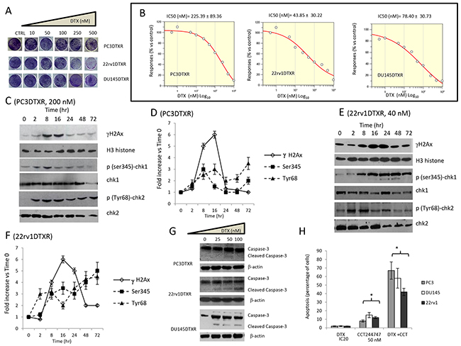 Next, we confirmed that DTX resistant cell derivatives were effectively resistant to this compound. In Figure 2A we show plate image representations of crystal violet stained DU145DTXR, 22rv1DTXR and PC3DTXR cells grown in 24 well plates cultured with different doses of DTX (0-500 nM) and having significant higher IC50 values (Figure 2B) to those observed for DTXS cell strains reaching 225 nM (PCE3DTXR), 44 nM (22rv1DTRX) and 78 nM (DU145DTXR). Also in DTXR cells, DTX at IC50 values for each cell lines induced DNA damage response (DDR) characterized by γH2AX phosphorylation and Chk1/2 kinase activation (Figure 2C in PC3DTXR and Figure 2E in 22rv1DTXR cells). Our data shows that γH2AX reached maximal levels at 8-16 hours both in PC3DTXR (Figure 2C, 2D) and 22rv1DTXR (Figure 2E, 2F) cells, then returned to baseline values at 48 and 72 hours suggesting that DNA damage was repaired. Chk1 kinase activation (p-Ser345) levels increased in a time-dependent manner in 22rv1 cells (Figure 2E, 2F) whereas reached maximal levels up to 16 hours in PC3 Figure 2C, 2D), then went down and remained at sub-baseline values. The levels of p-Tyr68 Chk2 remained elevated until the 8 hour time point (Figure 2D, 2F), then decreased at the 16 hour time point and reached maximum values at 48 and 72 hours. In both cell lines the levels of Chk1 and Chk2 were maintained high and the levels of γH2AX decreased, suggesting that DNA was not repaired. As expected, caspase-3 activity and apoptosis were not observed (Figure 2G) as the cells are DTXR. The protective role of Chk1 was further tested by using 50 nM CCT244747 (Figure 2H) showing synergistic effects in association with DTX.