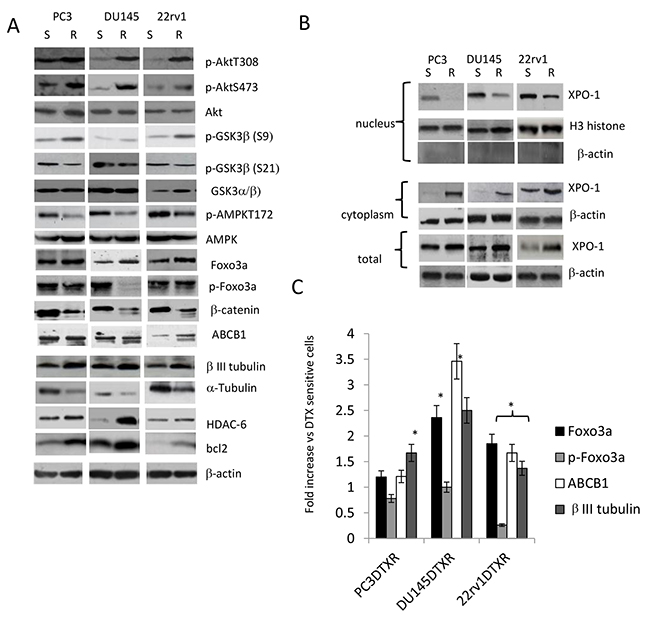 Figure 3: (A) Differences in molecular arrangements on DTX sensitive and resistant CRPC cell lines. (B) Nuclear and cytoplasmic expression of XPO1 in sensitive and resistant CRPC cell lines. Western blot for nuclear extracts were also blotted with anti β-actin antibody to verify the presence of cytosolic proteins. (B) Foxo3a, p-Foxo3a, ABCB1 and βIII tubulin levels in DTX resistant CRPC cells expressed as fold increase (C) vs DTX sensitive cells. Each lane was loaded with 100 mg of proteins. Graphs were made analyzing three different western blots. * p<0.001