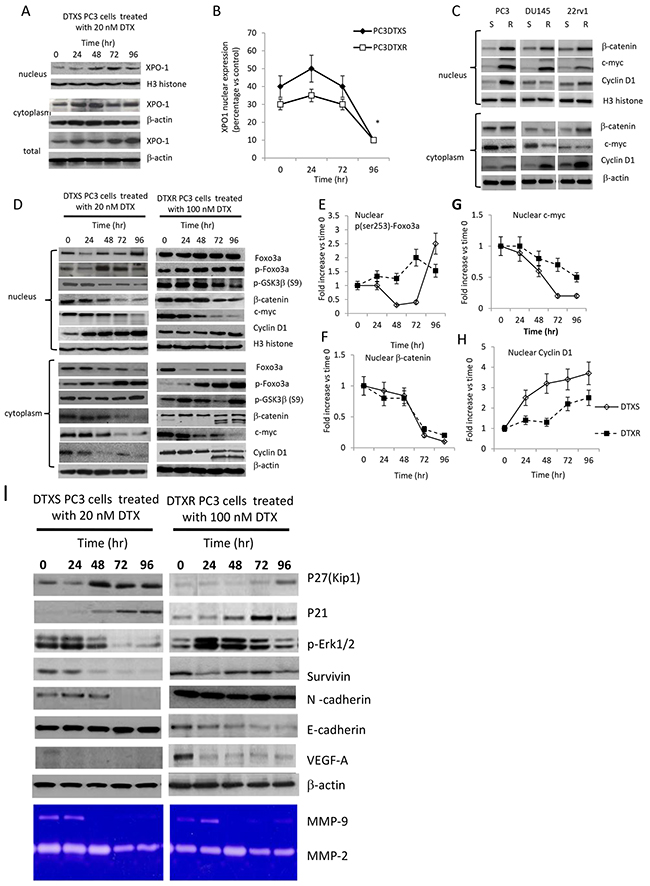 Figure 4: (A) Effects of 10 nM DTX in DTXS cells (time-dependent trend) on XPO1 expression in nuclear, cytoplasmic and total cell extracts. (B) Differences in the modulation of XPO1 expression, normalized vs Histone H3, during DTX administration in DTXS (DTX=10 nM) and DTXR (DTX=200 nM) PC3 cell strains. (C) Nuclear and cytoplasmatic Expression of β-catenin and its related targets (c-myc and cyclin D1) in DTX resistant and sensitive CRPC cells. (D) Modulation of nuclear and cytoplasmatic expression of GSK3β/Foxo3a/β-catenin and related target proteins (c-myc and cyclin D1) in DTXS and DTXR PC3 cell strains treated with 10 and 200 nM DTX, respectively. Immunoblots for p-Foxo3a, β-catenin, c-myc and cyclin D1 were normalized first versus the levels of Histone H3 and next on the levels at Time 0 (T0). Three western blots were analyzed and data expressed as mean of fold increases versus T0 ± Standard Error (SE). (E) Modulation of nuclear expression levels of p-Foxo3a in PC3DTXS and PC3DTXR cells; (F) modulation of nuclear expression levels of β-catenin in PC3DTXS and PC3DTXR cells; (G) modulation of nuclear expression levels of c-myc in PC3DTXS and PC3DTXR cells; (H) modulation of nuclear expression levels of cyclin D1 in PC3DTXS and PC3DTXR cells. (I) Western blot and zymographic evaluation of antiproliferative/cell cycle dependent (p21 and p27), EMT (Survivin, VEGF-A, N-cadherin and metalloproteinases) and Epithelial (E-cadherin) related targets.