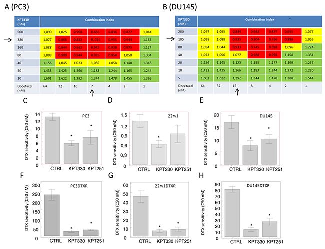 Figure 5: Synergy head maps for Combination Index (CI), calculated by Chou-Talay method. (A) PC3 synergy map calculated for selinexor and DTX co-treatment. (B) DU145 synergy map calculated for selinexor and DTX co-treatment. (C) Reduction of DTX sensitivity (IC50) calculated for PC3 cultured with selinexor and KPT-251 at IC20 values of 100 nM and 78 nM, respectively. (D) Reduction of DTX sensitivity (IC50) calculated for 22rv1 cultured with selinexor and KPT-251 at IC20 values of 75 nM and 56 nM, respectively. (E) Reduction of DTX sensitivity (IC50) calculated for DU145 cultured with selinexor and KPT-251 at IC20 values of 50 nM and 58 nM, respectively. (F) Reduction of DTX sensitivity (IC50) calculated for PC3DTXR cultured with selinexor and KPT-251 at IC20 values of 120 nM and 85 nM, respectively. (G) Reduction of DTX sensitivity (IC50) calculated for 22rv1DTXR cultured with selinexor and KPT-251 at IC20 values of 90 nM and 75 nM, respectively. (H) Reduction of DTX sensitivity (IC50) calculated for DU145DTXR cultured with selinexor and KPT-251 at IC20 values of 135 nM and 92 nM, respectively. Synergy is showed in the red boxes, additivity in yellow boxes and competition in green boxes. Black arrows represent the IC50 values for both compounds.