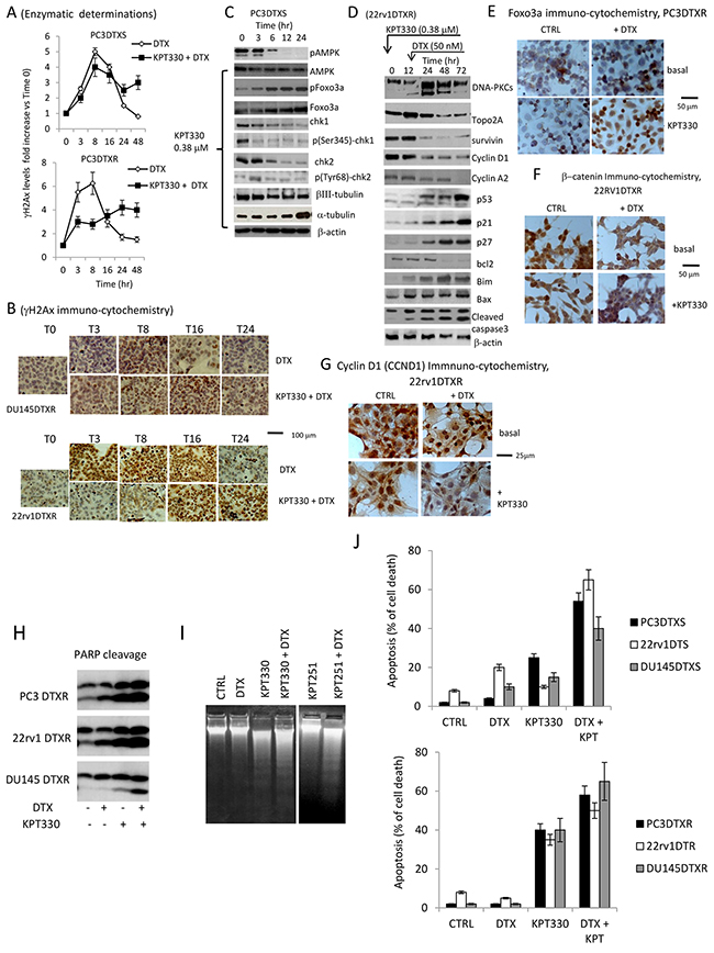 In order to demonstrate that selinexor increased DNA damage and slowed down DNA repair when used in combination with DTX, we evaluated the changes in the γH2AX expression by ELISA in PC3 DTXS and PC3 DTXR cells. This analysis levels revealed that DTX-induced DNA damage signals (such as γH2AX) could not promote complete DNA damage repair in both DTX sensitive and resistant cells after pre-treatment with selinexor (Figure 6A). Indeed, we observed, a complete return to baseline levels of γH2AX at 24 and 48 hours in single agent DTX treatment but nor when DTX was combined with selinexor. In Figure 6B we show immunocytochemical pictures performed on DU145 DTXR and 22rv1 DTXR cell strains demonstrating that in DTXR treated DU145 and 22rv1 cells γH2AX staining was significantly increased up to time 8 (T8) and later. When we considered combined treatments, γH2AX levels reached maximal values at T8-T16 in DU145DTXR cells and at T16-T24 in 22rv1DTXR. Some mitosis of culture treated with DTX and selinexor in combination are strongly γH2AX positive. These mitosis result also aberrant. Next we evaluated the expression changes in Foxo3a, Chk1 and Chk2 after KPT330 (380 nM) administration focusing our attention on PC3 DTXS cells (Figure 6C). We observed that 380 nM selinexor increased steady state levels of FOXO3 and this could be due to p-AMPK down-modulation. This effect was time dependent and maximal from 12-24 hours (Figure 6C). Selinexor was able also to reduce total and phosphorylated levels of Chk1/2 as well as reduce βIII tubulin in the presence of significant levels of α-tubulin, the major target of DTX. Combination treatments were able to modulate several proteins involved in the regulation of cell cycle (p21, p27, cyclin D1 and cyclin A2) and apoptosis (bcl2, bim, bax) inducing caspase 3 cleavage (Figure 6D). In Figure 6E we show immunocytochemical evaluation of the increase of Foxo3a after DTX and combined DTX plus selinexor treatment. Foxo3a appears to be increased mainly in the nucleus of DTX plus selinexor treated cells. Similarly we observed by immuno-cytochemistry that total and nuclear β-catenin (22rv1DTXR, Figure 6F) expression levels were significantly reduced in single DTX or selinexor administration but mainly in combined treatments. Cyclin D1 (DU145DTXR, Figure 6G) levels were increased in the nucleus of DTX treated cells but abrogated after selinexor administration alone or in combination with DTX. In addition, we observed that DTX-induced PARP1 cleavage was increased after combination with selinexor (Figure 6H) as result of a reduced or slowed down selinexor-inhibited DNA damage repair, as previously reported (reference: Ranganathan et al 2016). This finding is associated with increased DNA fragmentation (DNA laddering, Figure 6I) and apoptosis (Figure 6J). In Figure 6H we show also the effects of KPT251.