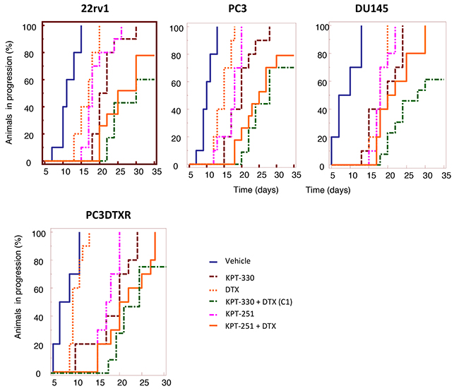 To determine the effects of selinexor or KPT-251 administration on DTX sensitivity in vivo we evaluated two SINE compounds (selinexor and KPT-251) in combination with DTX in PC3, DU145, 22rv1 cell lines, and in DTX resistant PC3 DTXR. The cells were subcutaneously injected in athymic male nude mice. In order to reduce the probability of biases due to differences in tumor engraftment we analyzed the tumor progression the parameter “Time to Progression (TTP)”, defined as the time (days) necessary to double the tumor volume for each tumor, comparing differences of TTP by Kaplan Meyer distribution. Xenografted mice were randomly assigned to receive therapeutic doses of selinexor, KPT-251 or DTX and combinations as described in Materials and methods.