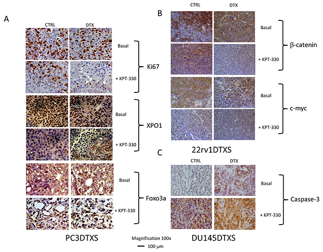 We demonstrate that combination between selinexor and DTX (Tables 1 and 2) significantly increased the efficacy of single treatments evaluated by tumor weight reductions measured at the end of drug administration in PC3, DU145 and 22rv1. Selinexor restored also the sensitivity to DTX of PC3 DTXR (Table 2). The calculation of combination indices revealed that the combination involving selinexor and DTX significantly increased the efficacy of single treatments evaluated as tumor weight reductions with synergistic effects both in PC3 DTXR (CI=0.64) and 22rv1 (CI=0.50) xenografts and additive effects in PC3 (CI=0.95) and DU145 (CI=1.12) xenografts. The number of tumors in which progression was: (i) 10/10 in the animal groups of CTRL and in those treated with selinexor, KPT-251 and DTX, and 7/10 (selinexor + DTX) and 8/10 (KPT-251 + DTX) in PC3 tumors; (ii) 10/10 in the groups of CTRL and in those treated with DTX, selinexor, KPT-251 and in the combination KPT-251 + DTX and 6/12 in the group treated with selinexor + DTX in DU145 tumors; (iii) 10/10 in the groups of CTRL and in those treated with DTX, selinexor and KPT251, whereas progression was observed in 6/10 in the group of animals treated with selinexor + DTX and 8/10 in that treated with KPT-251 and DTX in 22rv1 tumors.