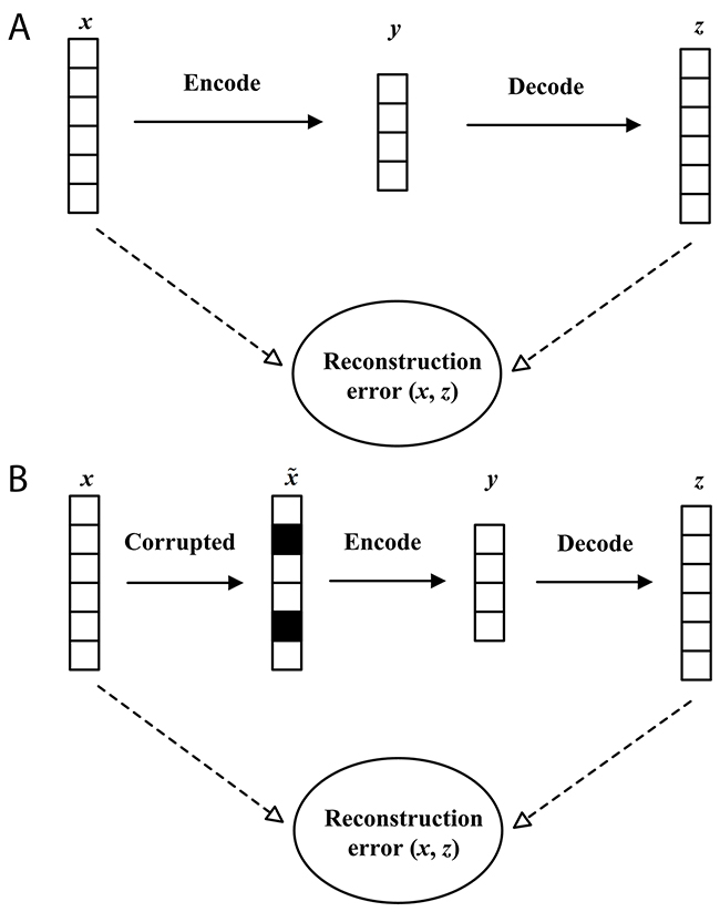 Figure 1: The graphical representation of Autoencoder (A) and Denoising Autoencoder (B).