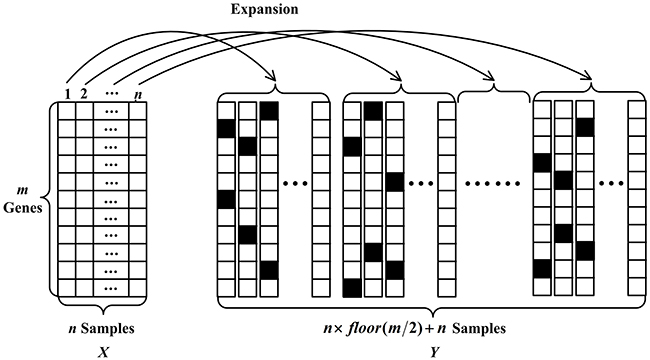 We give the visualization of SE method in Figure 2. Denote a tumor gene expression dataset as with each row representing a gene and each column representing a sample. To be more specific, here, we set to 2. In Figure 2, the values of the corrupted genes are filled with black in expanded samples. Statistically, for the first sample in , expanded samples are obtained by using SE method. Including the first sample in , samples are obtained from one sample. Other samples in are processed in the same manner. Finally, samples are stored in a matrix that can be taken as the training data. By utilizing SE, a large number of training samples can be obtained. The expanded samples maintain the merits of the corrupted data and address the problem of insufficient training samples of gene expression data to a certain extent.