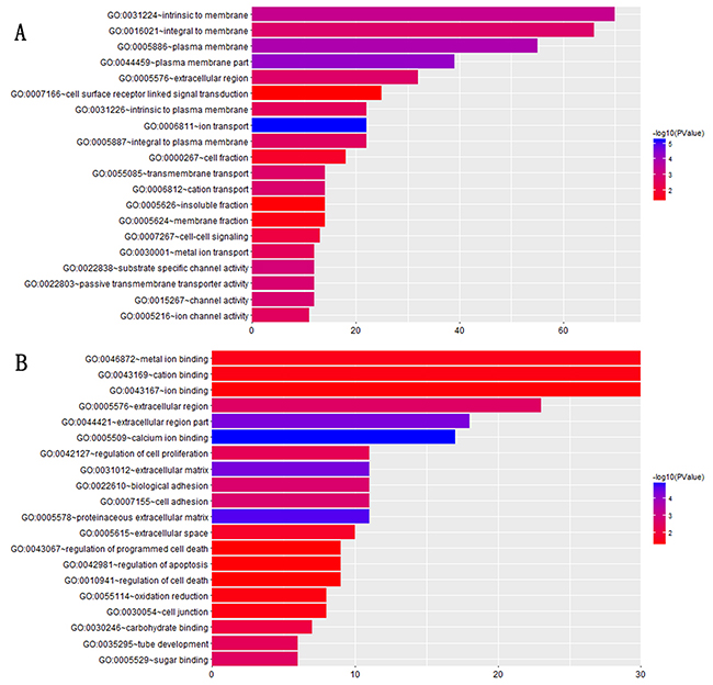 Figure 3: GO annotation and enrichment plot for (A) module1, (B) module2. The colors of each annotation depict the statistical significance of functional enrichment and the bars show the number of target genes contained in the corresponding annotation.
