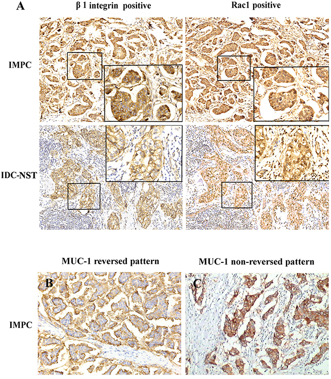 Figure 4: (A) Immunohistochemical stain of β1 integrin and Rac1 in IMPC and IDC-NST (×200). β1 integrin was predominantly expressed on the cell membrane with brown-yellow color, whereas Rac1 was primarily expressed in the nucleus and cytoplasm. (B) Reversed immunohistochemistry pattern of MUC-1 in IMPC, which was defined as the presence of complete linear reactivity on the outer surface of tumor cell clusters facing stroma (×200). (C) Nonreversed immunohistochemistry pattern of MUC-1 in IMPC, which was defined as whole cytoplasmic membrane staining of tumor cell clusters (×200).