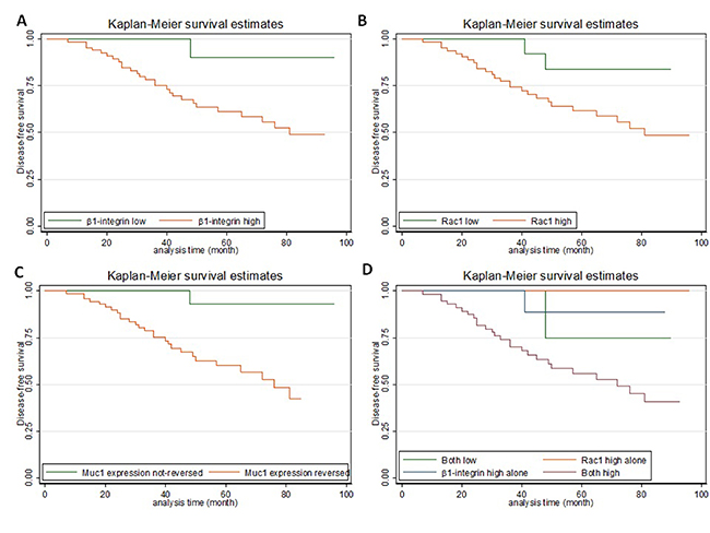 Of 100 IDC-NST samples, 63 (63%) demonstrated high β1 integrin levels and 67 demonstrated high Rac1 levels. β1 integrin and Rac1 levels were significantly greater in IMPC than IDC-NST (Z = –2.571, P = 0.010; and Z = –1.988, P = 0.047 respectively) (Table 2).