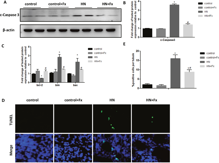 Figure 4: Febuxostat reduced apoptosis of renal tubular cells in hyperuricemic rats. (A) Western blot analysis of c-caspase3 in the kidney tissue lysates of hyperuricemic rats. (B) The densitometry analyses of western blots for c-caspase3 are shown. (C) Expression of pro-apoptotic genes (bax, bcl-2, and bim) were measured by Real-time PCR. (D) TUNEL staining to measure the apoptosis of renal tubular epithelial cell in each rat group (Original magnification: ×200). (E) Quantitative analysis of the number of apoptotic cells in each rat group. Data are presented as means ±SEM of four groups. n = 8;* P<0.05 vs. control group. # P<0.05 vs. HN+Fx group.