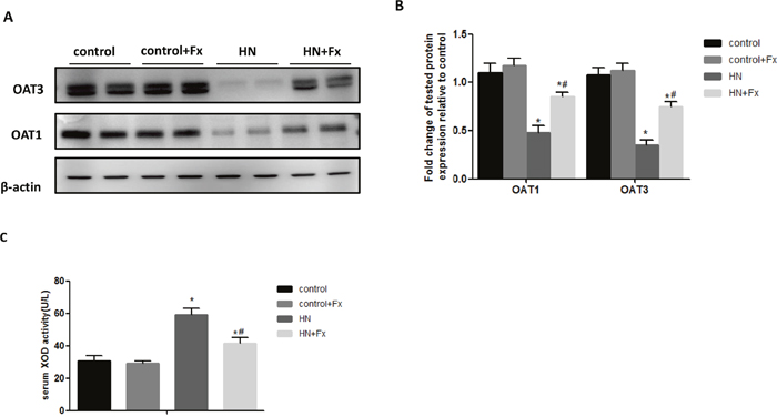 Figure 5: Febuxostat reversed the expression of OAT1 and OAT3 and increased serum XOD activity in hyperuricemic rats. (A) Immunoblot analysis with specific antibodies against OAT1, OAT3 in the kidney tissue lysates of hyperuricemic rats. (B) The densitometry analyses of western blots are shown. (C) Serum XOD activity was examined by XOD kit. Data are presented as means ±SEM of four experiments. n = 8;*P<0.05 vs. control group. # P<0.05 vs. HN+Fx group.