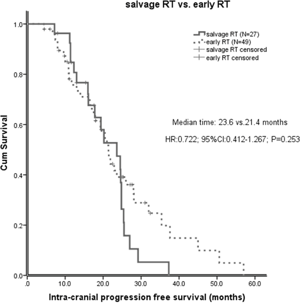 Some limited studies recommended patients harboring EGFR mutation with brain metastases to receive EGFR-TKI first, in the hopes of delaying or obviating the need of WBRT and the subsequent risks of neurocognitive side effects from brain RT [13, 21]. There is an ongoing trial of comparing upfront erlotinib with WBRT at initial presentation to erlotinib alone with WBRT at disease progression in patients with EGFR-mutant lung adenocarcinoma with BM (clinicaltrials.gov ID NCT01763385), with mature data pending. We found that after salvage brain RT, IC-PFS and OS of the patients did not differ significantly between early RT and salvage RT group, with a median IC-PFS of 23.6 months and 21.4 months, respectively (P=0.253) and a median OS of 24.6 months and 28.1 months, respectively (P=0.383). These results suggest that the use of early TKI, with deferral of RT until intracranial progression was not associated with inferior IC-PFS and OS. Additionally, for those asymptomatic from BM or did not experience CNS progression with effective systemic therapy, patients may be spared from concerns of neurotoxicitis from early brain RT.