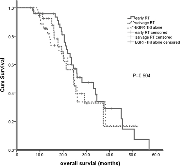 Our study showed that there was no significant difference of OS between the early RT, EGFR-TKI alone and salvage RT groups (28.1 months vs. 24.5 months vs. 24.6 months, P=0.604). It seemed that the addition of brain RT to EGFR-TKIs did not appear to have survival benefit to that of EGFR-TKI alone in EGFR-mutant NSCLC with BM. However, one has to note that the patients with early RT had more poor prognostic factors than those without early RT. The similar OS between these groups may suggest effectiveness of brain RT. It is possible that omission of brain RT in these patients with poor prognostic factors might result in worse survival. This data is hypothesis generating. A prospective randomized study is needed to answer this question.