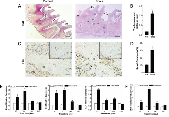 Figure 1: Osteogenesis and miR-34a expression of alveolar bone under orthodontic force loading. (A) H&E staining showed the morphological characteristics and distance of tooth movement during orthodontic tooth movement for 14 days. Scale bars: 500 μm. n=3. (B) Statistical analysis of tooth movement distance. n=6. (C) Representative immunohistochemical staining showed Runx2+ cells of alveolar bone during orthodontic tooth movement for 14 days. Black arrows marked positively stained dark-brown granules. Scale bars: 100 μm and 20 μm. n=3. (D) Statistical analysis of Runx2+ signals in images was similar to those shown in Figure 1C. (E) qRT-PCR analysis of osteogenic genes, Runx2, ColI, and ALP during orthodontic tooth movement. n=3–4. (F) qRT-PCR analysis of miR-34a during orthodontic force loading. n=3–4. Data represent the mean ± SD of three independent experiments. *P<0.05 vs. the control lateral bone by paired t-test. FM: first molar. SM: second molar. DR: dental root. PDL: periodontal ligament. DPDL: distal PDL. DB: distal bone. TB: tensile lateral bone. CB: compressive lateral bone. M: mesial. D: distal. d: moving distance of FM or the distance between FM and SM.