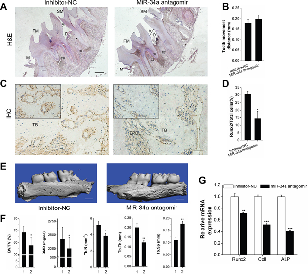 Figure 7: Declining osteogenesis of local N-Ac-l-Leu-PEI-mediated miR-34a antagomir delivery on alveolar bone and OTM in vivo. (A-E) The alveolar bone of rats was locally injected with N-Ac-l-Leu-PEI/miR-34a antagomir (and inhibitor-NC), and the legends of Figure 7A–7G corresponded to those from Figure 6 (A–G). 1 and 2 presented the inhibitor-NC lateral and miR-34a antagomir lateral. Data represent the mean ± SD of three independent experiments. *P<0.05 vs. the inhibitor-NC lateral bone by paired t-test.