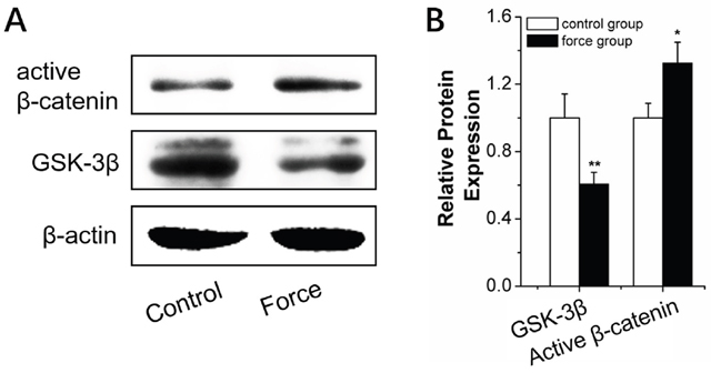 Figure 8: Wnt/β-catenin signal pathway analysis in BMSCs under strain. (A and B) Western blot (quality in A and quantity in B) analysis of Wnt/β-catenin-signal-pathway-related proteins, GSK-3β, and active β-catenin for 2 h under strain loading. n=3. Data represent the mean ± SD of three independent experiments. *P<0.05 vs. the control group by paired t-test.