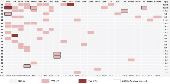 Figure 1 and Supplementary Table 4 summarize the details of the SNVs. After filtering, we found 63 concordant SNVs in 57 samples. The mean read depth of the targeted regions was 740.32. Non-synonymous SNVs were identified in 23 out of the 57 cases (40.35%). We found a high percentage of C>T changes (nearly 46%), probably due to the dipyrimidine context (Supplementary Table 4) [13]. As other authors have noted [8], some of the cases had more than one SNV per gene, as in the cases of EP300, BTK, CSF1R and CD19.