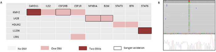 Figure 2: Mutational landscape in 6 cHL-derived cell lines and Sanger sequencing validation. (A) The diagram shows the distribution of mutations per cell line. One SNV is indicated in red, while two SNVs per gene are indicated in dark red. Black boxes correspond to SNVs validated by Sanger sequencing. (B) Representative example, CARD11 mutation in the KMH2 cell line; IGV diagram (Ion Torrent sequencing) and Sanger sequencing representation.