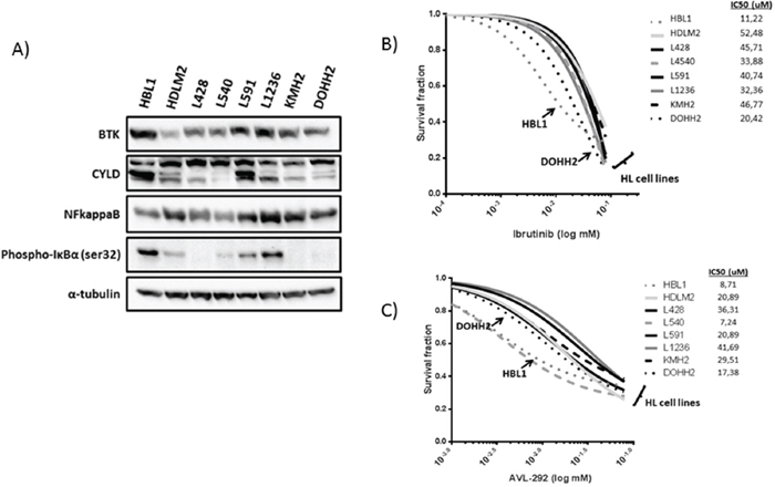 Figure 3: Functional studies in cHL-derived and DLBCL-derived cell lines. (A) Western blot analysis of total BTK, CYLD truncation, NFKB (p52 isoform), and phospho-IkBα. (B and C) Activity of BTK selective inhibitors in cHL-derived and DLBCL-derived cell lines. IC50 range calculation of HBL1, HDLM2, L540, and L1236 cell lines in the presence of different concentrations of Ibrutinib or AVL-292, after 48 hours.
