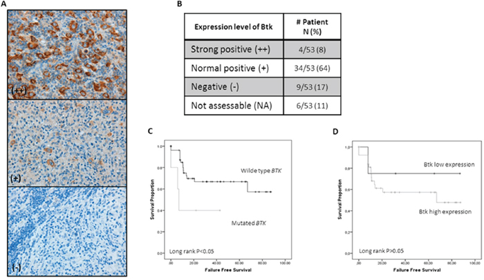 Figure 4: Btk IHC expression in HRS cells and Its correlation with survival. (A) Representative examples of IHC for Btk expression in cHL tissues. (B) Distribution of Btk protein expression in our series. Positivity (+) was concluded for cases with a level of expression comparable to that seen in normal germinal center B lymphocytes. (C) Kaplan–Meier survival curves demonstrate longer FFS in wt-BTK cases (P<0.05). (D) Survival curves demonstrate a longer FFS in cases with a low level of expression of Btk protein (P=n.s.).