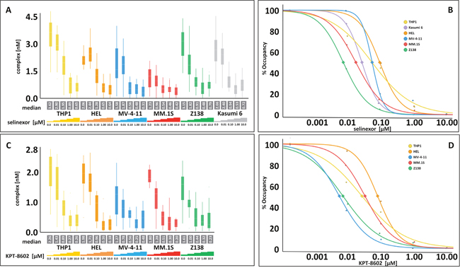 As a comparator to selinexor and KPT-8602, the FCCS occupancy assay was also performed on cell lines treated with 0, 0.01, 0.1, 1, and 10 μM LMB (Supplementary Figure 1). LMB exhibited very strong, nearly complete XPO1 occupancy in all cells lines (THP-1, HEL, MV-4-11, MM.1S, and Z138) at the lowest concentration tested (0.01 μM).