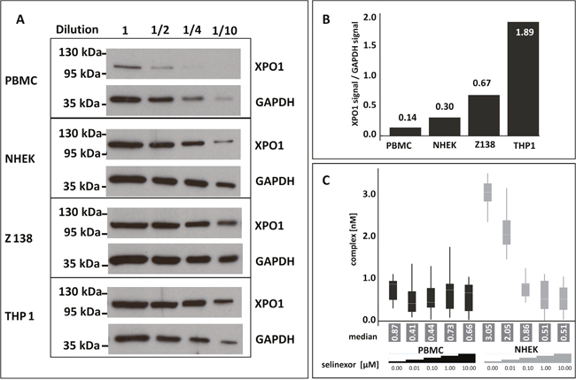 Figure 4: PBMCs are not adequate for measuring XPO1 occupancy by FCCS expression. (A) Untreated PBMCs, NHEK, Z138, and THP-1 cells were harvested, lysed, and equivalent amounts of serially diluted lysates from each cell type were immunoblotted for XPO1. (B) Expression levels of XPO1for each cell type were calculated relative to their GAPDH signal. (C) FCCS measurements of XPO1 occupancy from PBMCs and NHEK treated with 0, 0.01, 0.1, 1, or 10 μM selinexor for 4 hours. Lysates were incubated with fluorescence labeled LMB (LMB647) and ATTO488 labeled anti XPO1 antibody (XPO1 AB488) for 2 hours and complex formation was analyzed on a ConfoCor2 Correlation Spectroscope. The absolute values for the XPO1 complexes were plotted. The resulting values were fitted to a logistic regression curve using the TIBCO Spotfire software package.