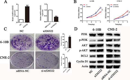 Figure 2: LncRNA-n326322 promotes NPC cell proliferation. (A) The efficiency of siRNA-n326322 and n326322 overexpression was determined by qRT-PCR. **P < 0.05 compared with control. (B) CCK8 assays indicated that the upregulation of lncRNA-n326322 promoted 6-10B cell viability, and the downregulation of lncRNA-n326322 inhibited the proliferation of CNE2 cells. **P < 0.05 compared with control. (C) Colony formation was used to analyze cell viability of transfected 6-10B and CNE-2 cells. **P < 0.05 compared with control. (D) The Western blot analysis showed the expression of the PI3K/AKT signaling pathways controlled by lncRNA-n326322.