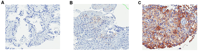 Figure 4: PD-L1 expression of representative samples: PD-L1, programmed death-ligand 1; EGFR, epidermal growth factor receptor. (A) EGFR-mutant (Del-19) (H-score: 0); (B) EGFR-mutant (L858R) (H-score: 10); (C) EGFR wild-type (H-score: 134).