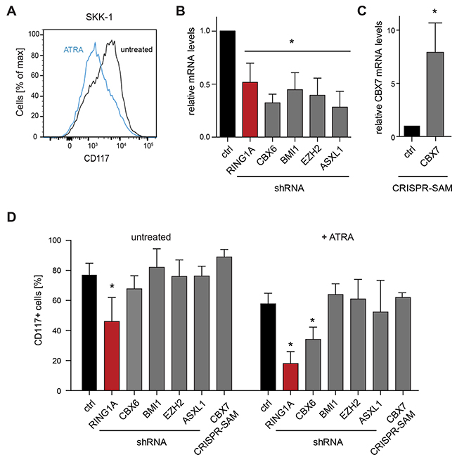 Figure 2: Genetic perturbation of PRC components in an MDS/AML cell line. (A) SKK-1 cells respond to the treatment with 1μM ATRA by diminishing the levels of the pluripotency marker CD117, which was assessed by flow cytometry. (B) Knockdown efficiency of different shRNAs against PRC1 (RING1A, CBX6 and BMI1) and PRC2 (EZH2 and ASXL1) components. Data for CBX6, BMI1, EZH2 and ASXL1 shRNAs represents an average from two different shRNA sequences for each gene. The relative expression of the corresponding mRNA assessed by qRT-PCR compared to control cells (ctrl) was set to 1. Data is represented as mean + SD (n ≥ 4; *, p<0.05 compared to control). (C) Overexpression of endogenous CBX7 using engineered CRISPR-Cas9 synergistic activation mediator (SAM). Data is plotted as in B. Data is represented as mean of three biological replicates + SD (*, p<0.05 compared to control). (D) Genetically perturbed SKK-1 cells shown in B and C were treated with ATRA as in A or left untreated. The percentage of CD117+ cells was assessed by flow cytometry. Data is represented as mean + SD (n ≥ 3; *, p<0.05 compared to control).
