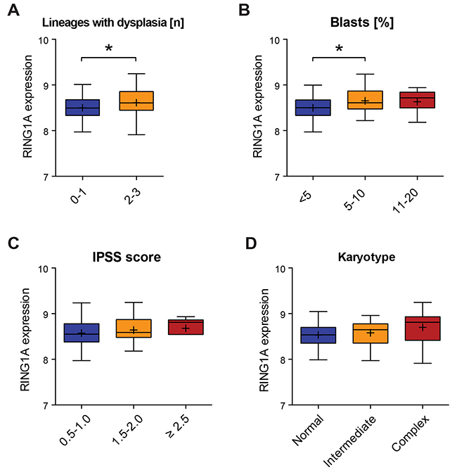 Figure 6: RING1A expression is associated with the number of dysplastic lineages. (A-D) Boxplots showing the expression of RING1A in patients grouped according to clinical characteristics [32]. For the number of patients that were considered in each category please see Supplementary Table 1. The same probe that scored different in Figure 1A was analyzed and the binary logarithm of its intensity is plotted as an indirect measure of gene expression. *, p < 0.05 using parametric unpaired T-test. A. RING1A expression according to number of lineages affected by dysplasia at diagnosis. B. RING1A expression according to percentage of blasts in bone marrow. C. RING1A expression according to IPSS scoring system [3]: 0.5 to 1.0, intermediate-1; 1.5 to 2.0, intermediate-2; and ≥2.5, high. D. RING1A expression according to karyotype with more than 3 alterations being considered as complex.