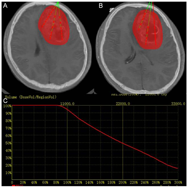 Before the operation, CT (GE Lights peed 16 CT scanner, 5mm slice thickness. 120 kV, 250-350 mAs, the contrast material injection rate was 3.0 ml/s) and MR (GE Signa HDx, Milwaukee, WI, USA) scans were required. Images for the CMGB group were fused in fusion software which we developed, and then transfer to the Treatment Planning Software (TPS, Beijing Astro Technology Ltd. Co.). Images for the CGB group were sent directly to the TPS. The objective of radiation treatment planning for brain tumors in TPS is to determine a seeds configuration with as few seed catheters as possible (to minimize operative risk) and to achieve an optimal conformation of the therapeutic dose with respect to the surface of the target volume.