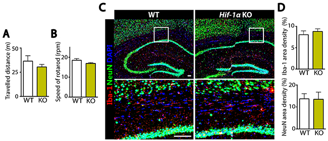 Figure 3: Without MCAO Hif-1α KO mice demonstrate similar behavioral outcome and comparable numbers of microglia and neurons to WT mice. (A) Open-field and (B) rotarod tests in WT or Hif-1α KO mice not subjected to MCAO (n = 7 mice per group). (C) Immunofluorescence staining of the brains using Iba-1 (red) and NeuN (green) antibodies in WT or Hif-1α KO mice not challenged with MCAO. Nuclei are counterstained with DAPI shown in blue. Scale bars indicate 100 μm. (D) Quantification of Iba-1 (upper) or NeuN (lower) area densities in C. Data are the mean ± s.e.m. for at least three independent fields examined per mouse, n = 4 mice per group.