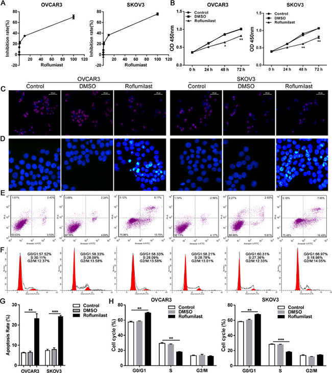 Figure 1: Roflumilast induces cell apoptosis and cell cycle arrest in ovarian cancer. (A) Different dose of Roflumilast was administrated to OVCAR3 and SKOV3 cells for 24 h and the cell vitalities were determined by CCK-8. (B) Two cell lines were treated with Roflumilast (15 μM) for indicated time and the cell vitalities were determined. (C) After the treatment of Roflumilast (15 μM) for 48 h, the proliferation and (D) cell cycle was analyzed by BrdU assay (magnification: 200x) and flow cytometry. The apoptosis was analyzed by (E, G) Hochest assay (magnification: 200x) and (F, H) flow cytometry. *p < 0.05, **p < 0.01, data represents the means ± s.d. Representative data are shown from 3 independent experiments.