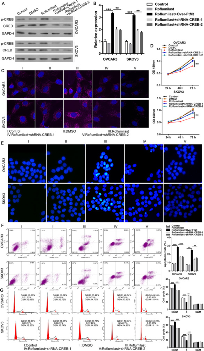 Figure 4: CREB is also required for FtMt-mediated anti-tumor effects of Roflumilast. After the knockdown of CREB in OVCAR3 and SKOV3 cells, the Roflumilast-induced (A) CREB and (B and C) FtMt levels were determined by WB, Q-PCR or immunofluorescence (magnification: 180X). (D) The cell vitality was analyzed by CCK-8. (E–G) The apoptosis and cell cycle were measured by Hochest and flow cytometry. *p < 0.05, **p < 0.01, ***p < 0.001, data represent the means ± s.d. Representative data are shown from 3 independent experiments.
