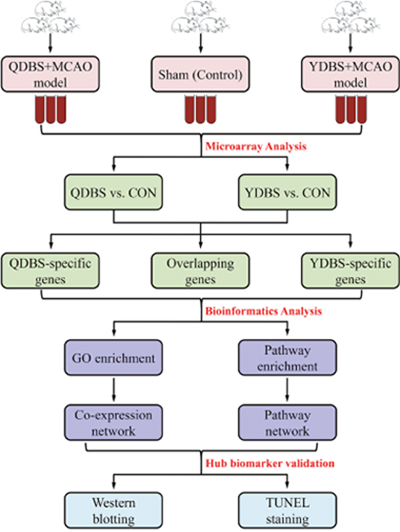 BSS, blood stasis syndrome; DAVID, database for annotation, visualization and integrated discovery; DEGs, differentially expressed genes; FC, fold change; FDR, false discovery rate; GO, gene ontology; KEGG, Kyoto encyclopedia of genes and genomes; MCAO, middle cerebral artery occlusion; QDBS, Qi deficiency blood stasis; TCM, traditional Chinese medicine; TUNEL, terminal deoxynucleotidyl transferase-mediated dUTP nick-end labeling; WBV, whole blood viscosity; YDBS, Yin deficiency blood stasis.