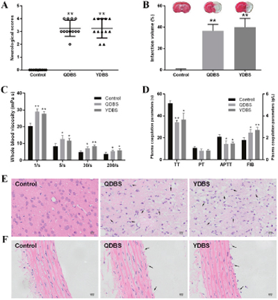 Figure 2: The morphological changes of ischemic stroke rats with QDBS or YDBS syndrome. (A) The neurologic score of rats after 24 h reperfusion (n=12). (B) The brain infarct volume after the neurological tests (n=6). (C) Whole blood viscosity (WBV) of shear rates’ varying from 1 to 200/s (n=6). (D) Coagulation parametersof plasma (n=6). The left Y-axis represents PT, TT and APTT value. The right Y-axis represents FIB value. Data presented as mean ±SD. *P < 0.05, **P < 0.01 compared with control group. Histopathological observation of cerebral cortex (E) and thoracic aorta (F).