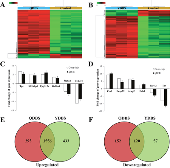Figure 3: The differentially expressed genes (DEGs) among the groups. Hierarchical clustering between QDBS (A) or YDBS (B) and control group. Green color represent down-regulated genes, red color represent up-regulated genes (P<0.05). Validation of a subset of genes differentially expressed between QDBS (C) or YDBS (D) and control group by qPCR. White bars represent the fold change at the expression level as indicated by microarray analysis; black bars represent the mean fold change of gene expression calculated by qPCR method. Values are the mean ± SEM (n = 6). The Venn diagram of up-regulated (E) and down-regulated (F) genes between QDBS/control and YDBS/control.