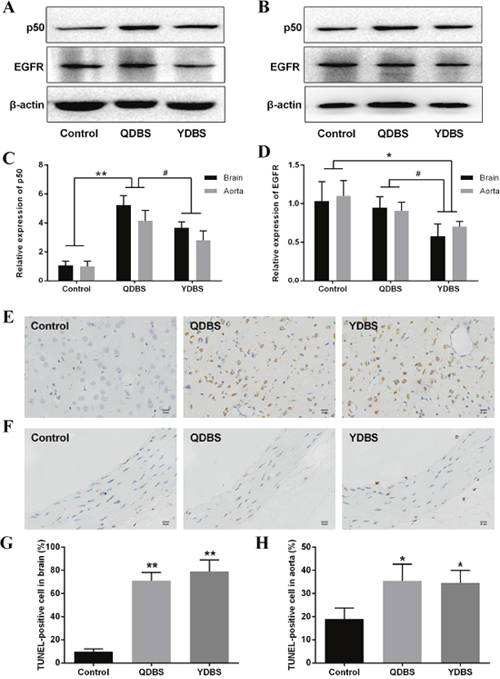 The hub genes and pathways were validated both in brain tissue and thoracic aorta. Western blotting results showed that NF-κB1 (p50) expression level in QDBS group was significantly higher than control and YDBS group, while EGFR expression level was significantly decreased in YDBS group compared to control and QDBS group (Figure 7A-7D). The expression of p105 was too low to analysis from the protein band, so the statistical analysis of NF-κB1 was mainly based on the expression level of p50. In order to examine the apoptosis level of ischemic stroke rats with BSS, TUNEL staining was used to quantify apoptotic cells. The data in Figure 7E-7F showed that there were massive TUNEL positive staining in both brain tissue and thoracic aorta of the two model groups.