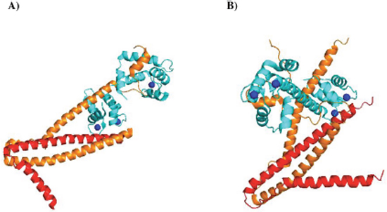 Figure 1: Structural representation of troponin complexes. (A) Crystal structure of the core domain of human cardiac troponin in Ca2+-saturated state, PDB 1J1E. (B) Crystal structure of the core domain of skeletal muscle troponin in Ca2+-saturated state, PDB 1YTZ. Cyan: Troponin C; Orange: Troponin I; Red: Troponin T. Blue spheres: Ca2+ ions. Both cartoon representations were rendered using PyMol software.