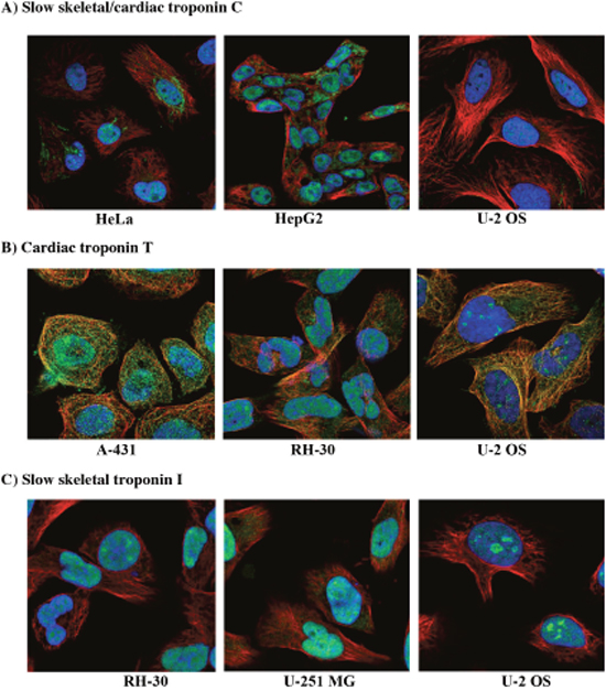 Figure 2: Immunocytochemistry images of troponin in human cancer cell lines. (A) Slow skeletal/cardiac troponin C staining in cervical carcinoma (HeLa), liver carcinoma (HepG2) and osteosarcoma cells (U-2 OS). (B) Cardiac troponin T staining in epidermoid carcinoma (A-431), rhabdomyosarcoma (RH-30), and U-2 OS cells. (C) Slow skeletal troponin I staining in RH-30, glioblastoma (U-251) and U-2 OS cells. In all cases, green represents the troponin subunit, blue staining is the nucleus and red is microtubules. Images obtained from (http://www.proteinatlas.org/cancer).