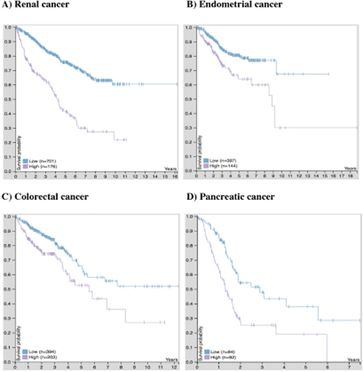Figure 3: Kaplan-Meier plots for TNNT1 expression in human cancers. “High” expression of TNNT1 in (A) Renal (B) Endometrial (C) Colorectal and (D) Pancreatic cancer is associated with an unfavorable (poor survival) prognosis. Plots represent the best separation between high (purple tracing) and low (blue tracing) mRNA expression based on fragments per kilobase million (FPKM) cut-off values that provided the highest level of significance. The FPKM cut-off values for renal, endometrial, colorectal, and pancreatic cancer were 0.5, 17.5, 0.7, and 1.1, respectively. Plots and calculated values were obtained from the online Human Pathology Atlas database on August 28th, 2017 [96].