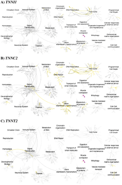 Figure 5: Reactome pathway analysis for three troponin genes. (A) TNNI1 (B) TNNC2 and (C) TNNT2. Gold and magenta lines indicate flagged pathways based on the analysis. Images from the Reactome database (http://reactome.org) were accessed through the Human Protein Atlas database (http://www.proteinatlas.org) in August 2017.