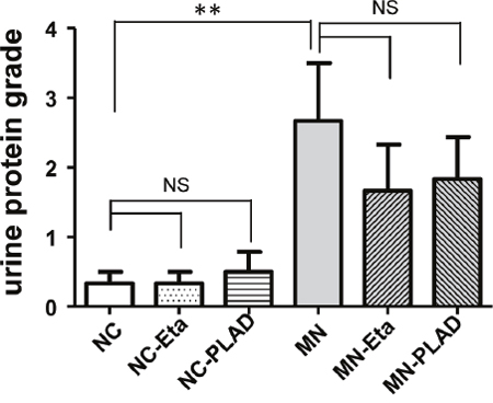 Figure 1: Effects of TNF blockade on proteinuria in mice with experimental MN. Urinary proteinuria of the normal control group (NC), membranous nephropathy group (MN), mice with membranous nephropathy receiving etanercept (MN-Eta) and mice with membranous nephropathy receiving preligand assembly domain fusion protein (MN-PLAD) were analyzed serially with urine strips. *p < 0.05 versus the control group. **p < 0.05 versus the MN group.
