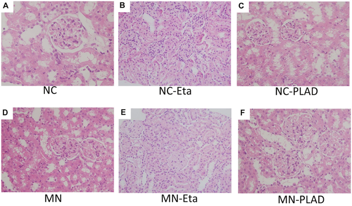 Figure 2: Changes in renal histopathology in mice with experimental MN as shown by H&E staining. Mice in the NC group (A–C) and MN group (D–F) were treated with PBS (A and D), etanercept (MN-Eta; B and E), or preligand assembly domain fusion protein (MN-PLAD; C and F) and the tissues were stained with H&E. All images are at 400× magnification.